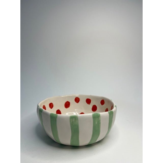 Ceramic Bowl - Green Stripes With Red Dots
